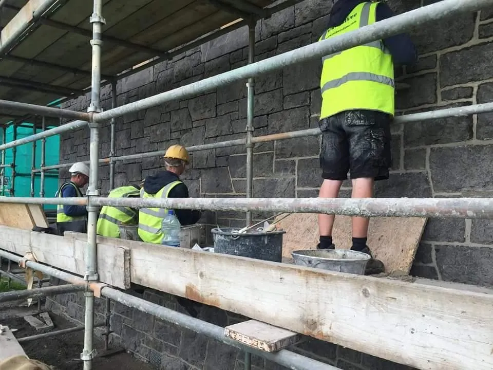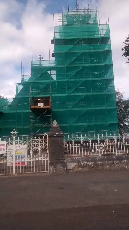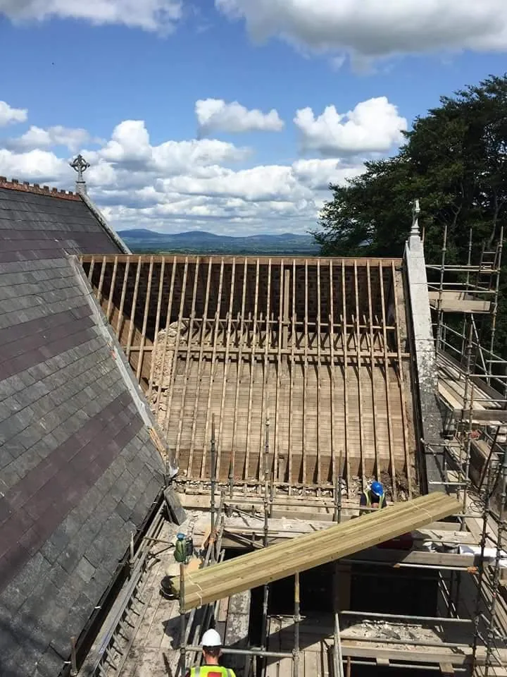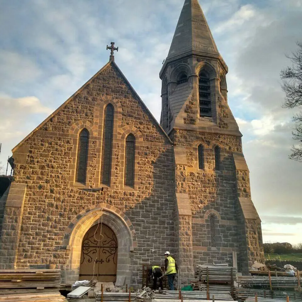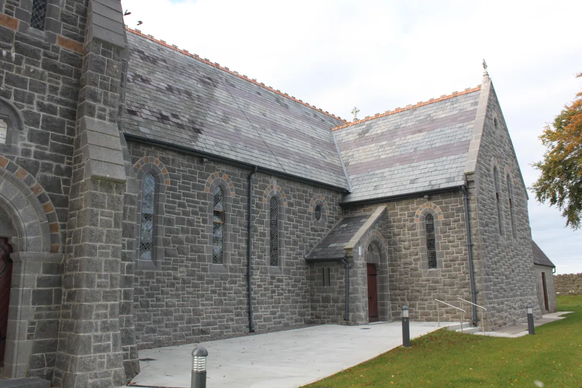 Templebraden project in 2015 consisted of a complete outer envelope conservation including roof reslating, rainwater goods, belfry repairs, lightning conductors, external lime pointing, stonework repairs, stained glass repairs, external drainage and paving, roof insulation.